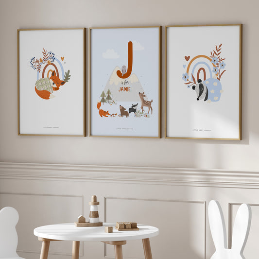 FOREST ANIMALS SET OF THREE PERSONALISED ART PRINTS