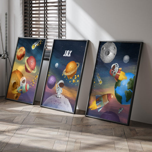 KIDS IN SPACE SET OF THREE PERSONALISED ART PRINTS
