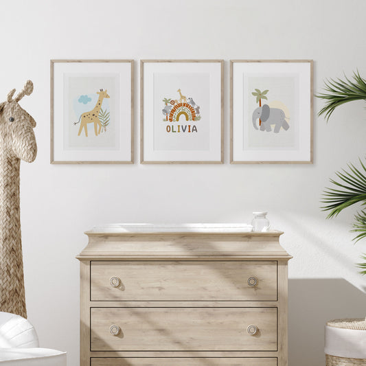 BABY SAFARI SET OF THREE PERSONALISED ART PRINTS